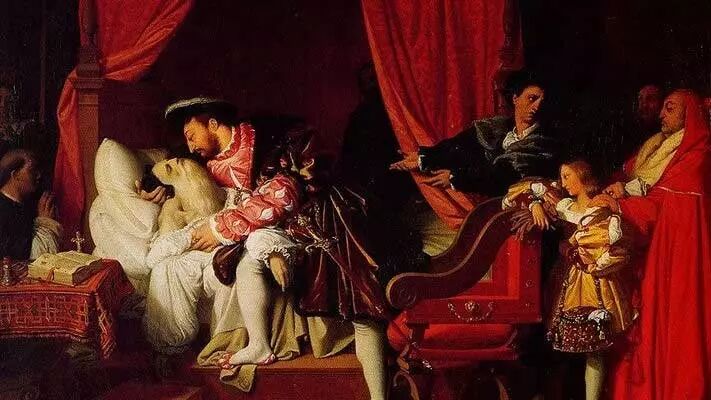 安格尔:《弗朗索瓦一世在达芬奇临终前》,藏于巴黎小皇宫。在这幅画中,新古典主义大师安格尔就临摹了提香的弗朗索瓦一世的侧面像。